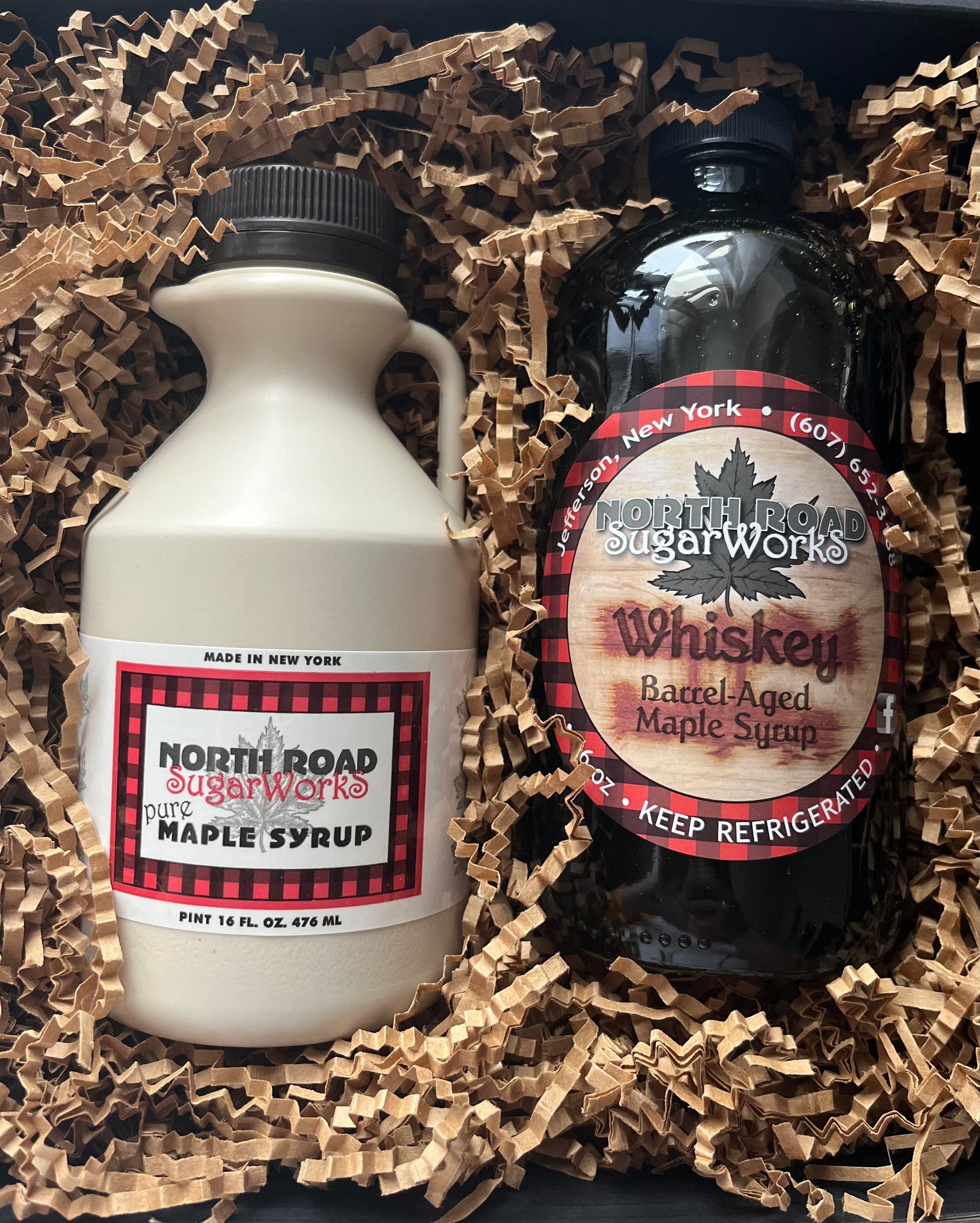 This black gift box contains a pint of our pure maple syrup and a pint of our whiskey barrel aged syrup. Whiskey barrel aged syrup is our pure maple syrup that is canned hot in a whiskey drum and aged for 6 months- a delicious new spin on traditional maple syrup. Barrel aged syrup is great on ice cream, BBQ or in your favoite cup of coffee.